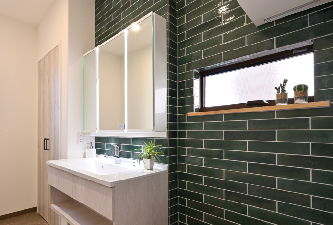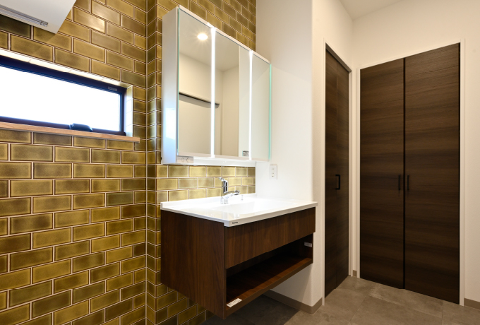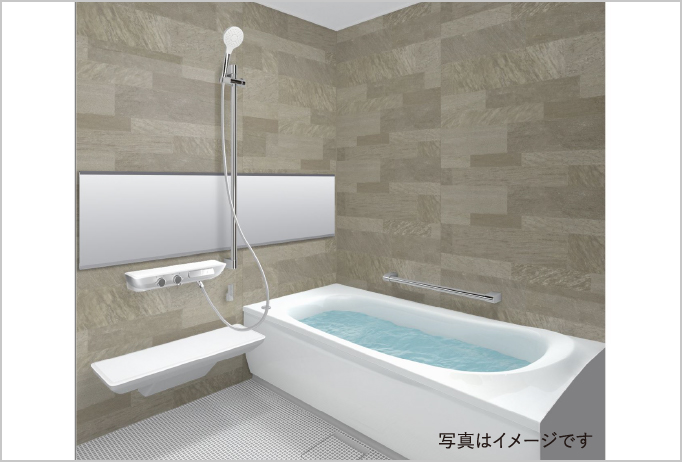 浴室空間に奥行き感と高級感が生まれるワイドミラーを採用。鏡の表面をダイヤモンド・ライク・カーボンでコーティングし、水垢汚れを抑止。