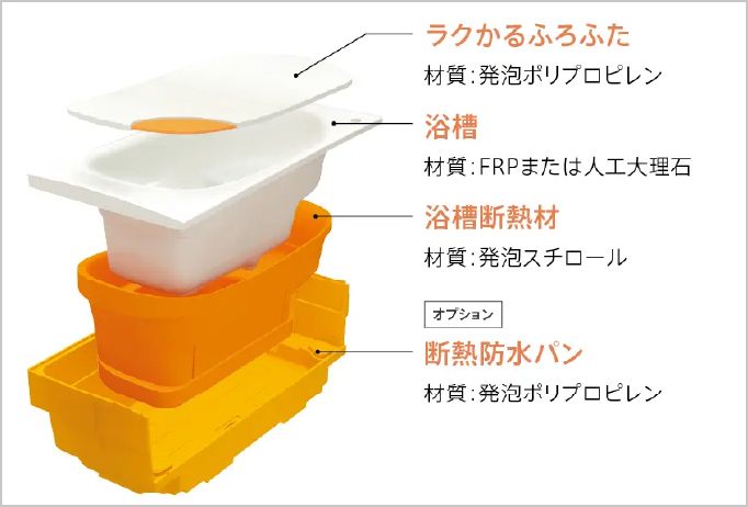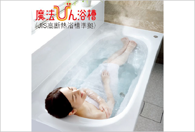 浴槽を断熱材で包み込んだ構造で、お湯はり後4時間以上経っても温かさを保つ魔法びん浴槽。