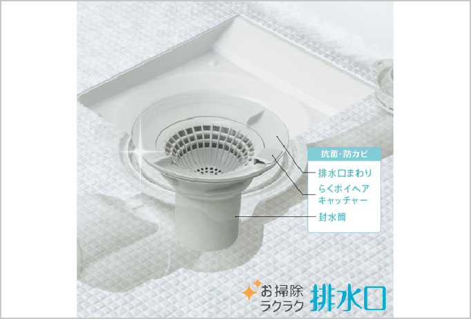 凹凸が少なく洗いやすい形状に加え、トラップカバーを開けて見える部分全てが抗菌・防カビ効果を持つ樹脂で、ぬめりやカビ汚れの増殖を抑えます。