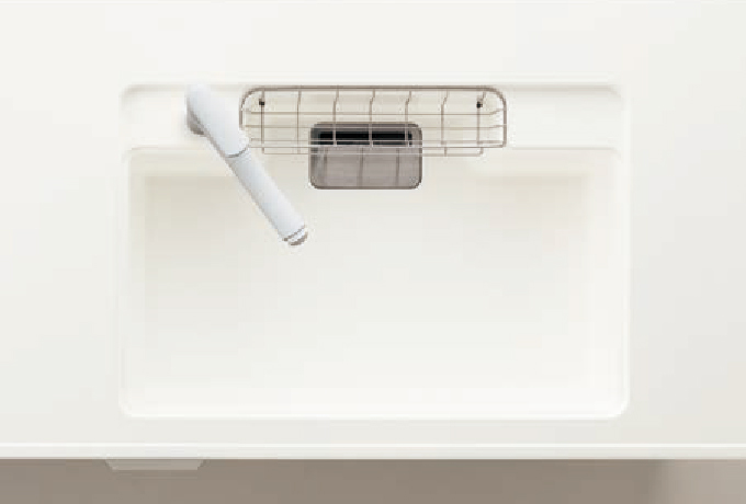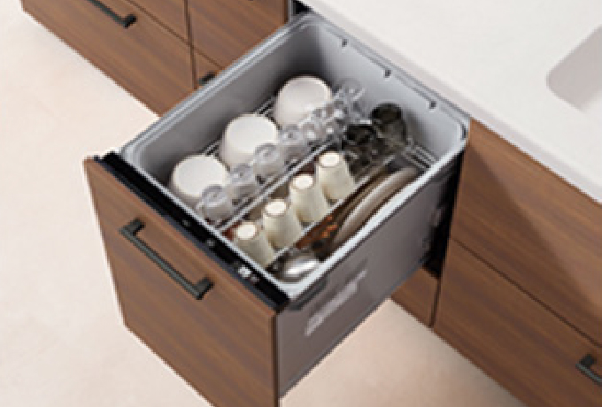 深型で洗い物が多い日も安心。キッチンの扉と同じ素材で仕上げられた、排水口や操作部のないスタイリッシュなフロントデザインがキッチン全体に自然と調和します。