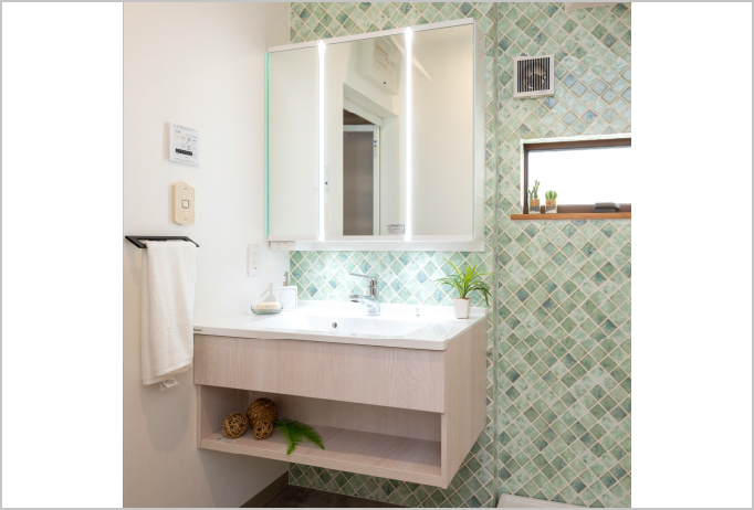 衛生面にも配慮した抗菌加工で、簡単お掃除で清潔続く。フロートタイプのデザインにこだわったキャビネットも特徴です。