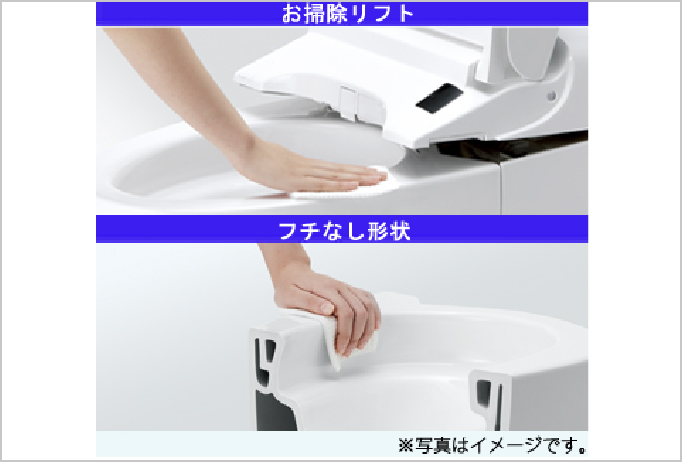 面倒なお手入れからサヨナラ!凹凸をそぎ落としたフチなし形状で便器裏がなくなり、サッとひと拭きで簡単キレイに。