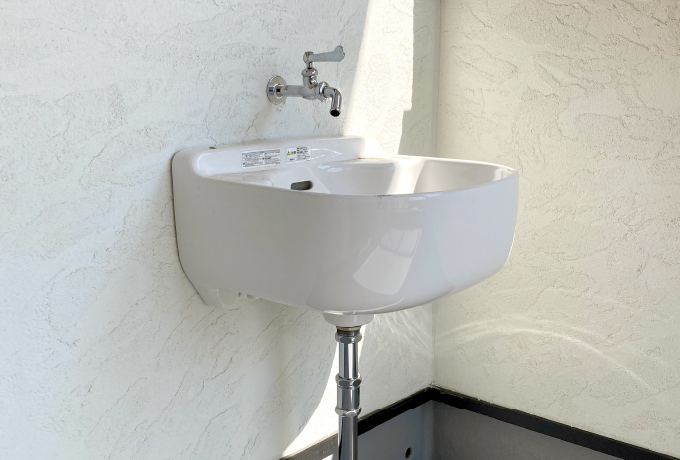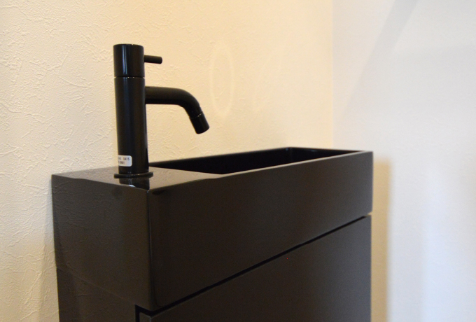 スリムながら収納も付いた手洗台。キャビネットにはトイレットペーパーも収納できます。