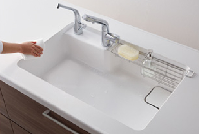 継ぎ目のないシンクはお掃除もラクラク。シンクの底に3度の傾斜があり、流れにくい野菜くずなども滑るように排水シンクへ。