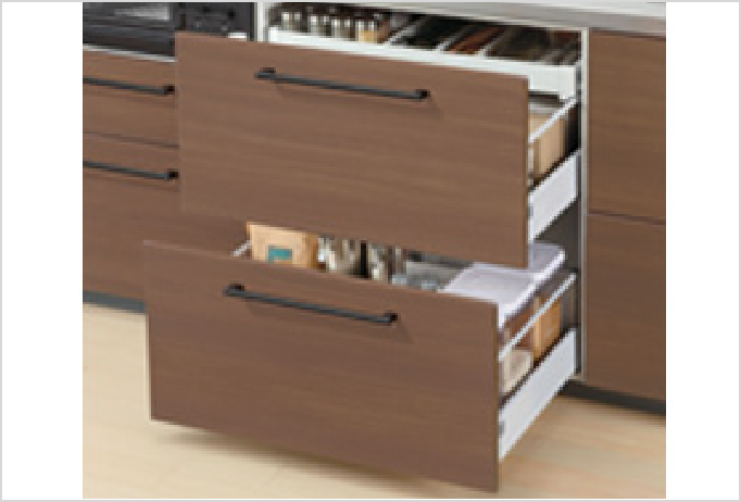 出し入れしやすく、たっぷり収納できる引き出し式のキャビネット。