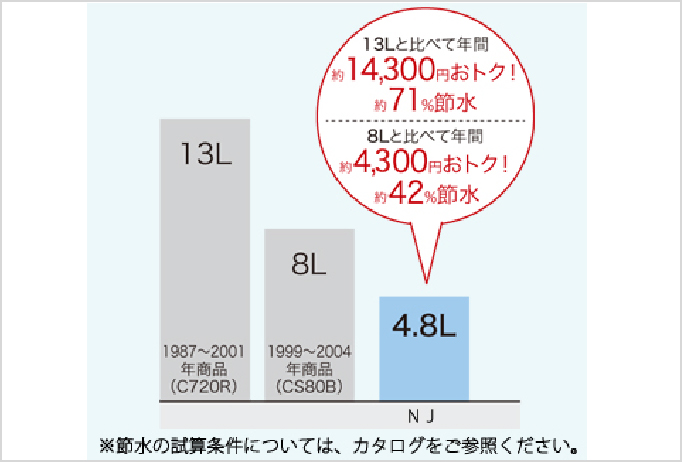 便器洗浄水量を13Lから4.8Lに。約71%の節水となり、13Lと比較すると年間約14,300円お得に。8Lと比較すると年間約42%の節水・約4,300円お得になります。