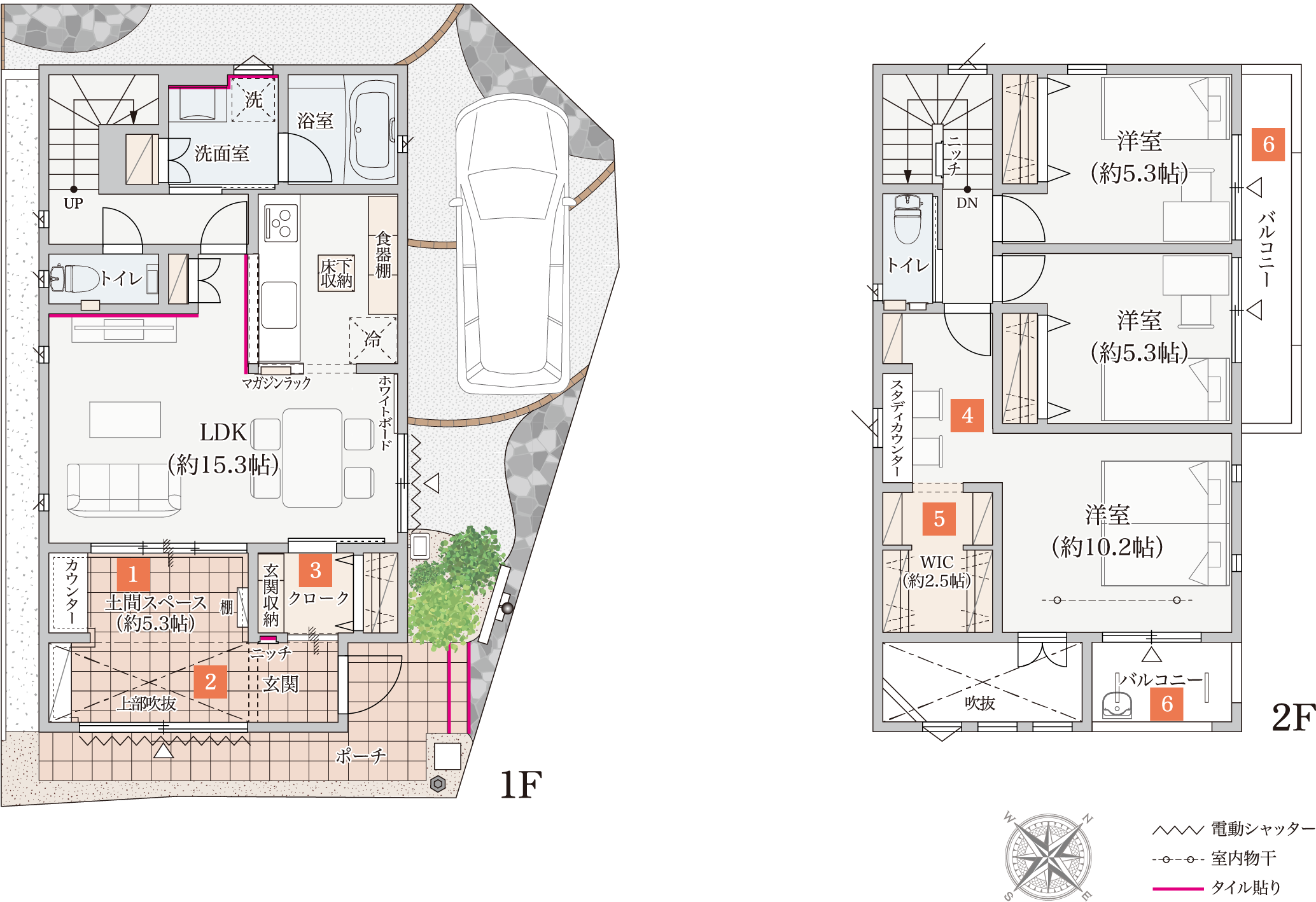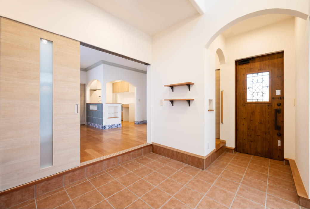 玄関を入ってすぐに広がる約5.3帖の土間スペース。リビングと一体的な広がりがあり、大きな開口部を開ければ屋外とのつながりも感じられ、ライフスタイルにあわせて個性的に使える空間です。