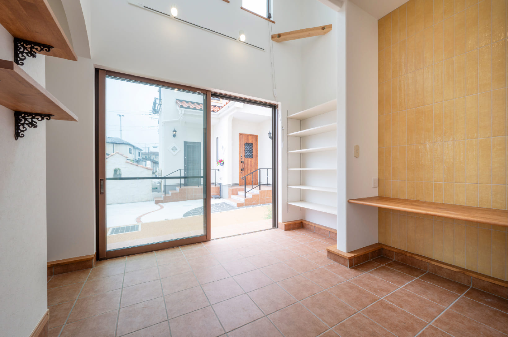 室内と屋外の間にある土間スペースは、趣味を楽しんだり好きなものを飾ったり、フットパスに面した小さなサロンも楽しめる、個性的に使える空間です。