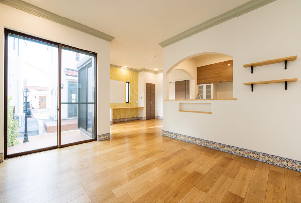 リビング・ダイニングに面した大きなテラスには、シェードやタープを張るためのフックを設置。日差しの強い日でもアウトドアリビングとして楽しむことができます。