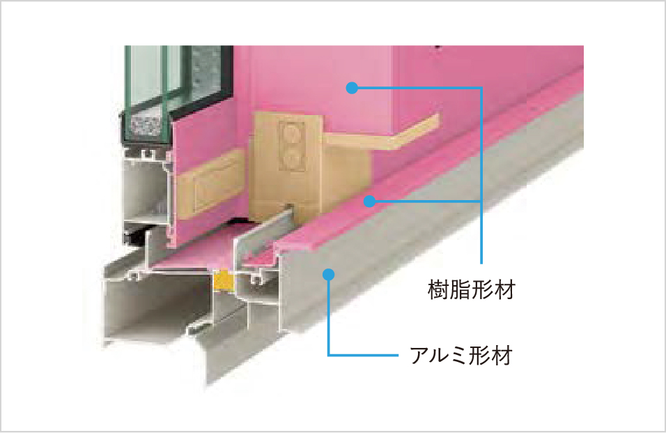 室外側は耐久性や強度に優れたアルミを採用し、雨、風、日差しによる劣化を防止。室内側には、アルミに比べ熱伝導率(熱の伝えやすさ)が約1/1000の樹脂を採用し、熱の出入りを抑えます。また、下枠にサーマルブレイク構造を標準採用。室外側と室内側の熱の伝わりを遮断することでカビ・ダニの要因となる結露の発生を抑制します。