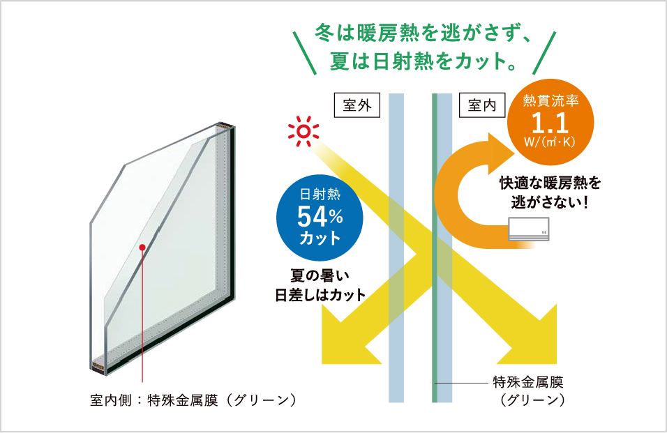 片側のガラスにコーティングされた特殊金属膜(Low-E膜)により、高い断熱効果を発揮。室内の快適な暖冷房熱を逃がさず、エアコン効率を高めて住まいの省エネ化にも貢献します。